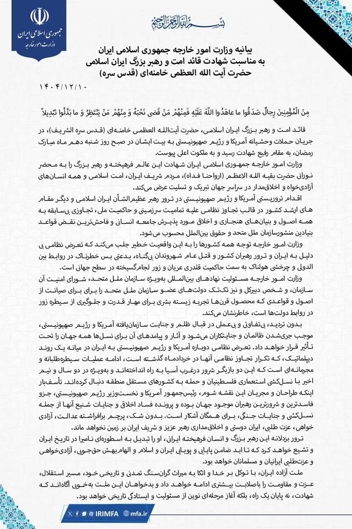 بیانیه وزارت امور خارجه جمهوری اسلامی ایران به مناسبت شهادت قائد امت رهبر بزرگ ایران اسلامی